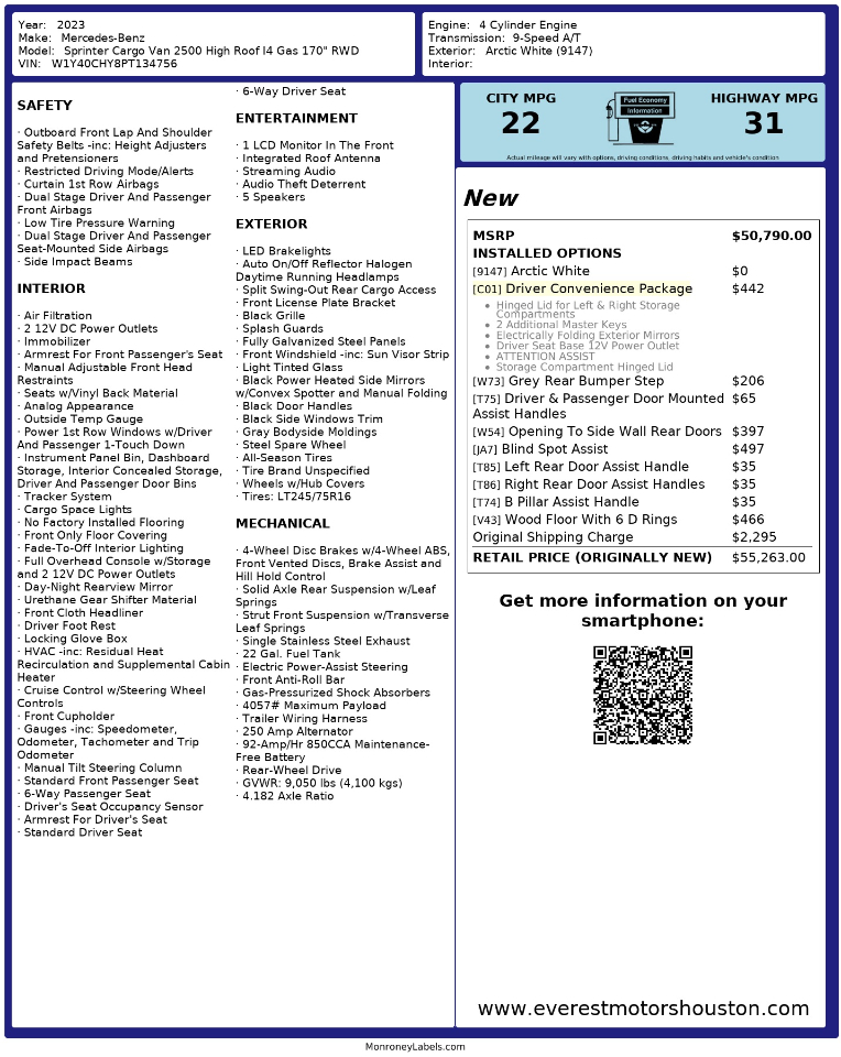 2023 Mercedes-Benz Sprinter Cargo Van 2500 HIGH ROOF LONGWB EXT RWD 2.0L 4CYL GAS